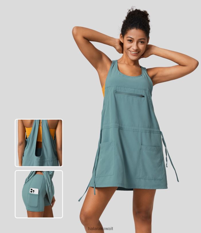 ملابس رياضية الحجر الأزرق TDP4N772 نحيف Halara فستان نسيم بدون ظهر، جيوب متعددة، رباط، قطعتين، سريع الجفاف، قصير للمشي لمسافات طويلة