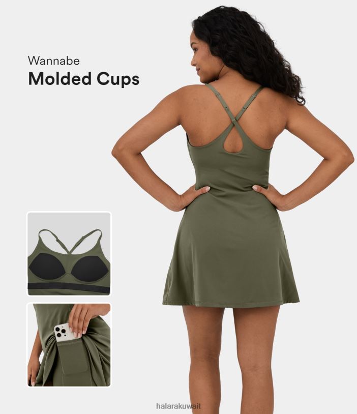 ملابس رياضية العشب الرمادي الأخضر TDP4N850 نحيف Halara فستان ناعم للتنس من القطيفة بدون ظهر وحزام قابل للتعديل 2 في 1 وجيب A Line صغير الحجم