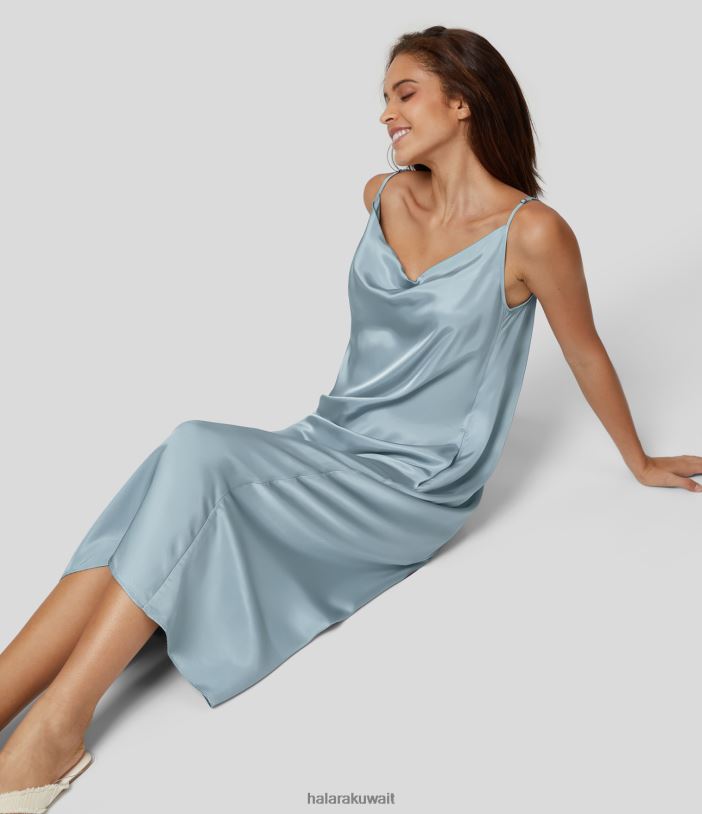 ملابس الأزرق الاسترليني TDP4N1234 نحيف Halara رقبة على شكل بقرة بدون ظهر وزر خلفي وجيب جانبي، فستان كاجوال سهل الانزلاق يشبه الساتان