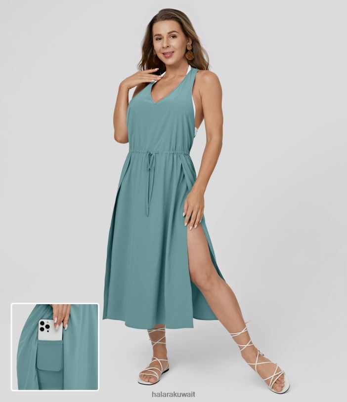 ملابس الأزرق المعدني TDP4N1217 نحيف Halara فستان ميدي كاجوال برقبة على شكل حرف V بدون أكمام وظهر مكشوف وجيب جانبي من قطعتين وجيب جانبي سريع الجفاف