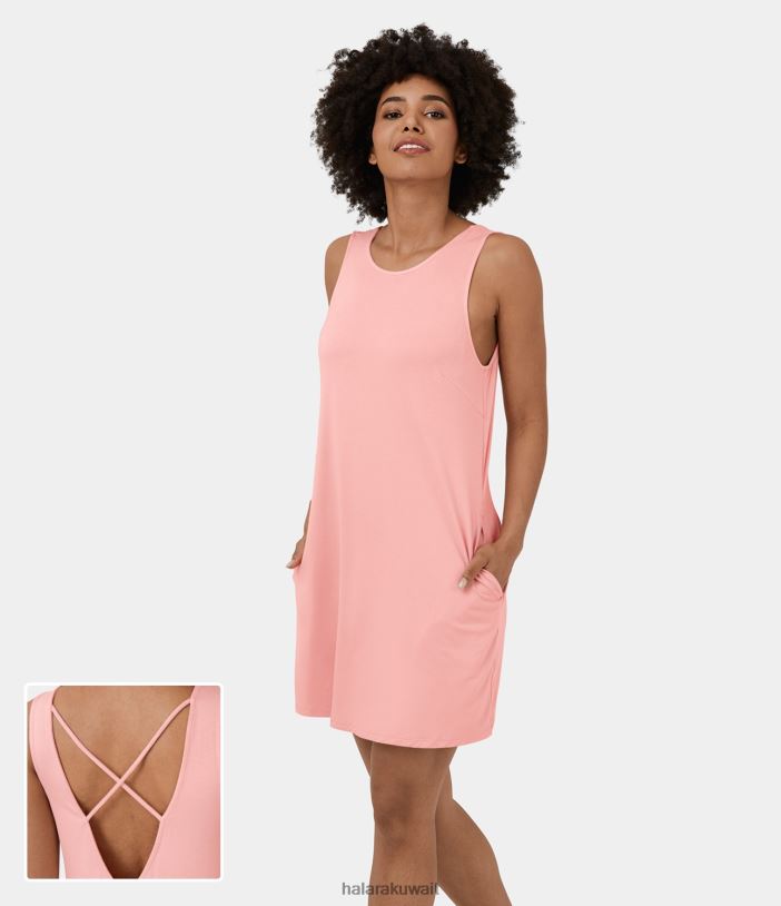 ملابس وردة شاحبة TDP4N1012 نحيف Halara فستان كاجوال قصير بياقة دائرية وبدون أكمام وظهر متقاطع وجيب جانبي